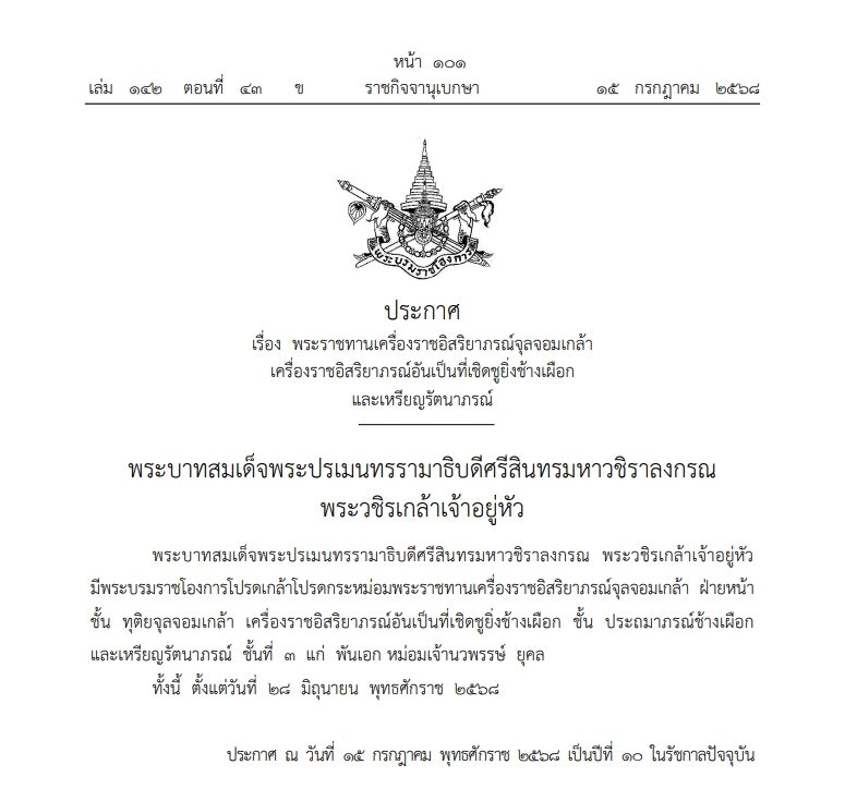 วันที่ 16 ก.ค.2568 ผู้สื่อข่าวรายงานว่า เว็บไซต์ ราชกิจจานุเบกษา เผยแพร่ประกาศ เรื่อง พระราชทานเครื่องราชอิสริยาภรณ์จุลจอมเกล้า เครื่องราชอิสริยาภรณ์อันเป็นที่เชิดชูยิ่งช้างเผือกและเหรียญรัตนาภรณ์ ความว่า