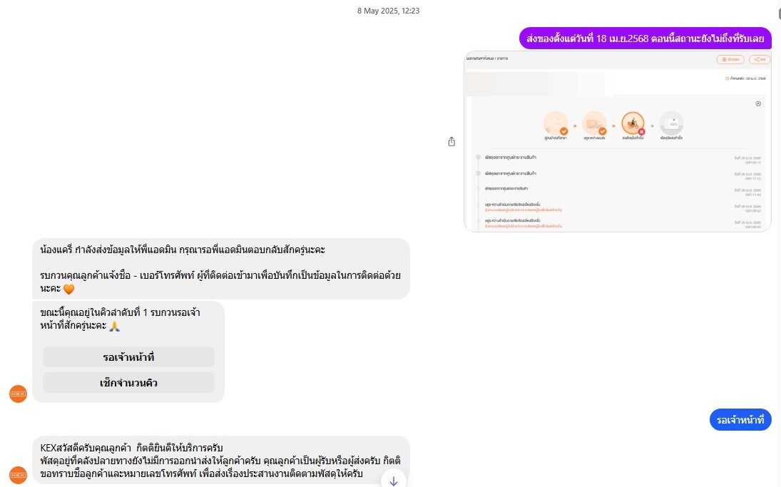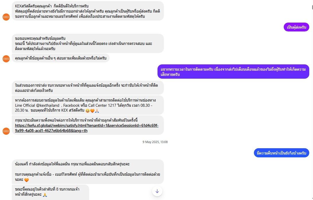 ต่อมาวันที่ 9 พ.ค.2568 ได้ติดตามความคืบหน้าในเรื่องดังกล่าวอีกครั้ง ซึ่งทางแอดมินของบริษัท ตอบกลับมาว่า เจ้าหน้าที่คนก่อนหน้านี้ได้ประสานงานเจ้าหน้าที่นำส่งพัสดุให้ถึงผู้รับโดยเร็วที่สุดเรียบร้อยแล้ว และจะเร่งติดตามความคืบหน้าเพิ่มเติมให้อีกครั้ง