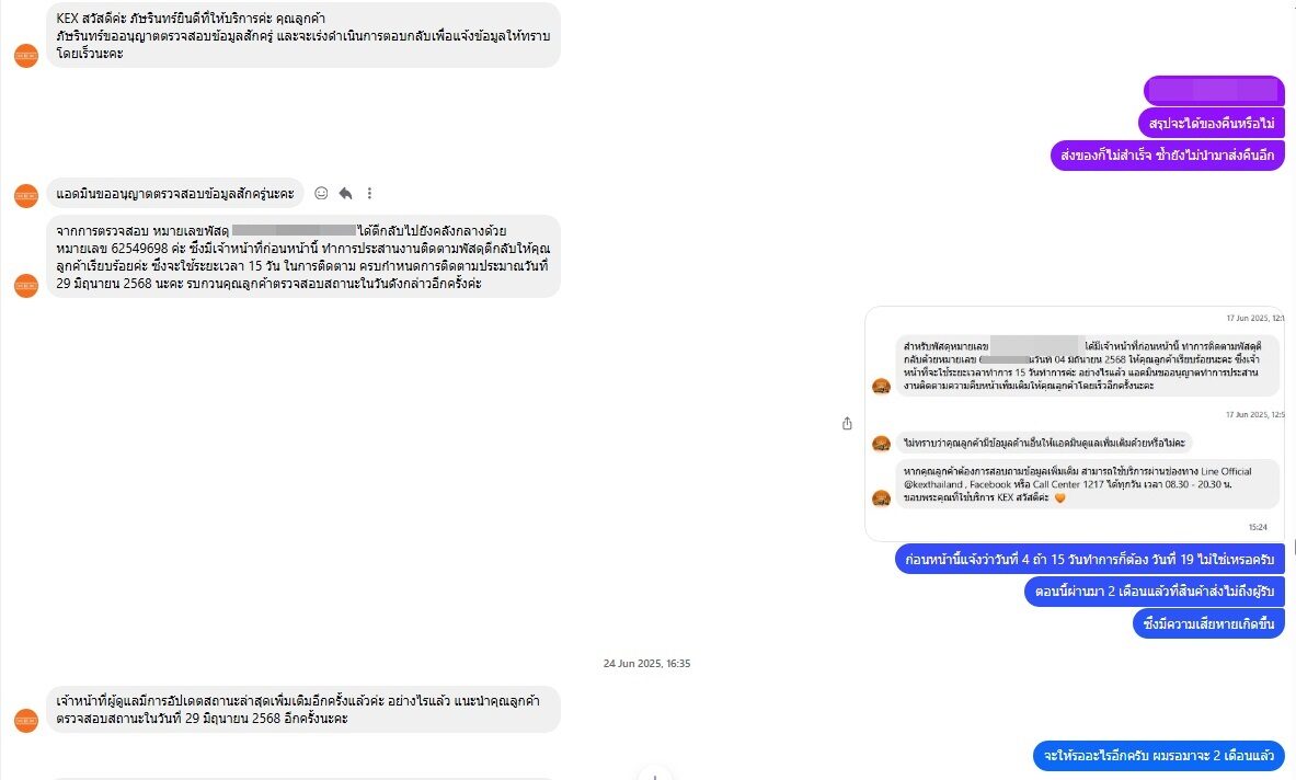 ต่อมาวันที่ 2 ก.ค.2568 ผู้ร้องสอบถามติดตามพัสดุอีกครั้ง ได้รับคำตอบเหมือนเดิมว่า เจ้าหน้าที่ติดตามพัสดุตีกลับให้ลูกค้าแล้ว จะเร่งประสานความคืบหน้าเพิ่มเติมให้โดยเร็วอีกครั้ง