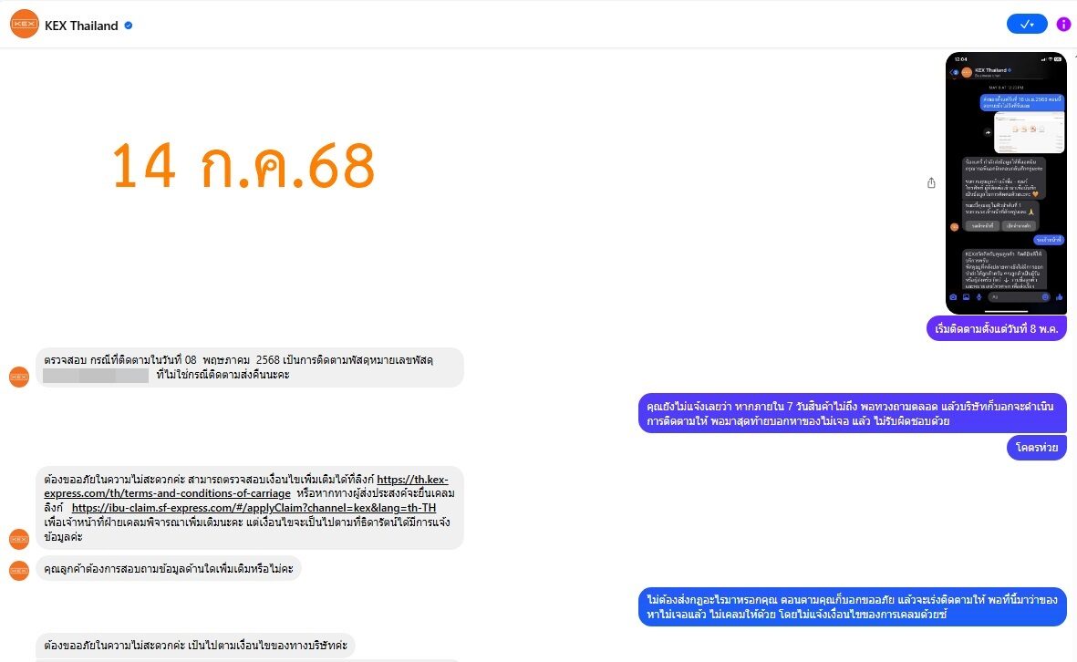 พร้อมทั้งยังระบุว่า ตามเงื่อนไขของทางบริษัท กรณีติดตามพัสดุส่งคืน หลังจากที่ตีกลับเข้าที่คลังสินค้าส่วนกลางต้องดำเนินการติดตามเข้ามาภายใน 7 วัน ตรวจสอบพัสดุมีการตีกลับเข้าที่คลังสินค้าส่วนกลางวันที่ 23 พฤษภาคม 2568 คุณลูกค้ามีการติดตามเข้ามาในวันที่ 04 มิถุนายน 2568 หากไม่สามารถตรวจสอบพัสดุได้แล้ว ในส่วนนี้จะไม่อยู่ในเงื่อนไขของการเคลม