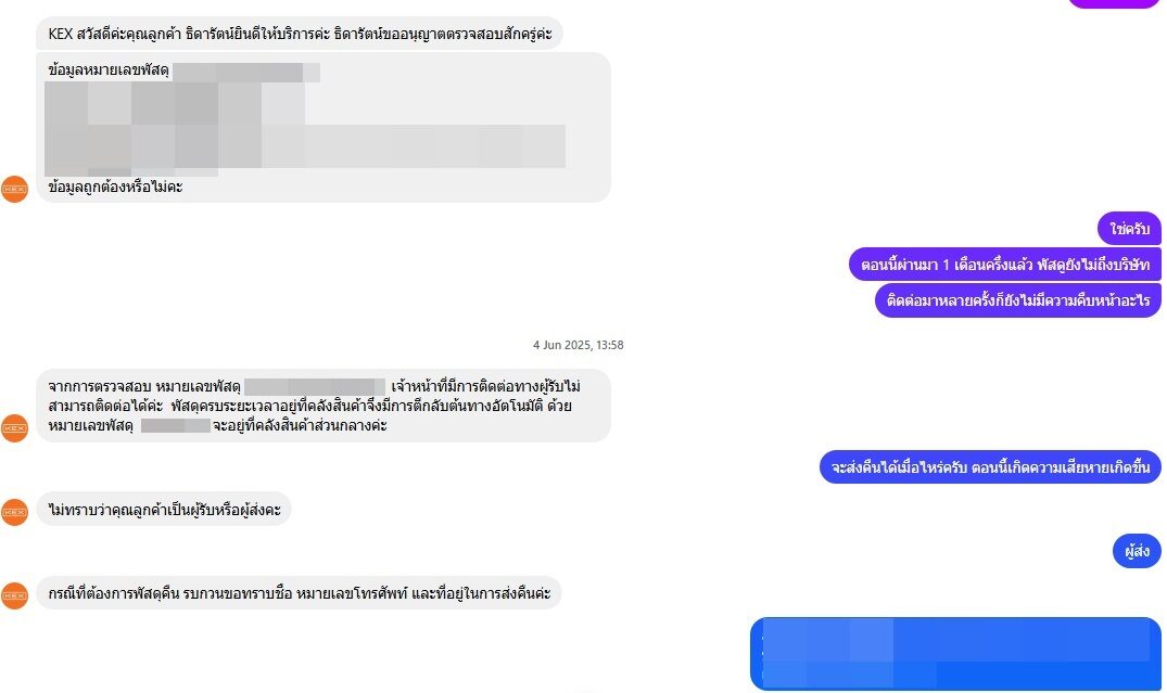 ต่อมาวันที่ 4 มิ.ย.2568 กลับไปทวงถามความคืบหน้าอีกครั้ง หลังสถานะพัสดุยังอยู่ที่เดิม ซึ่งเจ้าหน้าที่ตอบกลับมาว่า พัสดุอยู่ที่คลังสินค้า และจะตีกลับต้นทางอัตโนมัติ พร้อมขอชื่อที่อยู่ ในการส่งสินค้าคืน