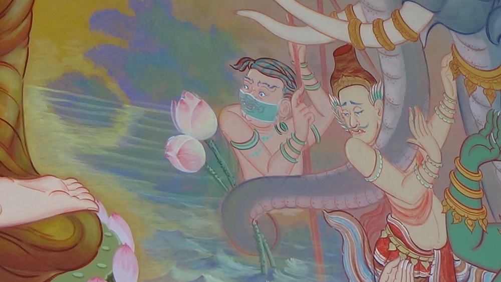 เมื่อวันที่ 13 เม.ย. ผู้สื่อข่าวเดินทางไปตรวจสอบยังวัดไผ่หมูขวิดศรัทธาธรรม ต.ยี่ล้น อ.วิเศษชัยชาญ จ.อ่างทอง หลังทราบว่าที่วัดดังกล่าววาดภาพจิตรกรรมฝาผนังพุทธประวัติ โดยมีการวาดเทวดา นางฟ้า สวมใส่หน้ากากอนามัย (แมสก์) โดยเมื่อเดินทางไปถึงก็พบผู้ที่กำลังวาดจิตรกรรมภาพเทวดา นางฟ้า สวมใส่หน้ากากอนามัยอยู่ โดยมีพระครูวิห์ธรรมาภิรักษ์ เจ้าอาวาสวัด คอยยืนดู