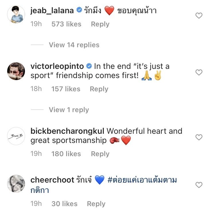 ขณะที่ แชมป์ พี่ชายของสาวเชียร์ก็เข้ามาคอมเมนต์ถามเจ้าของไอจีรายนี้ด้วยว่า“ประเมินแล้วให้ฉีดยาชาบริเวณซี่โครงร้าว เวลาชกจะได้ไม่เจ็บใช่มั้ยครับ”