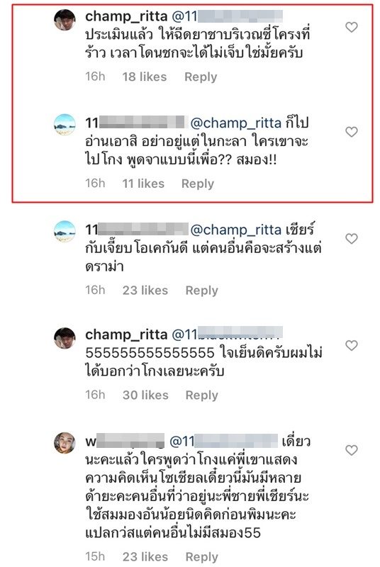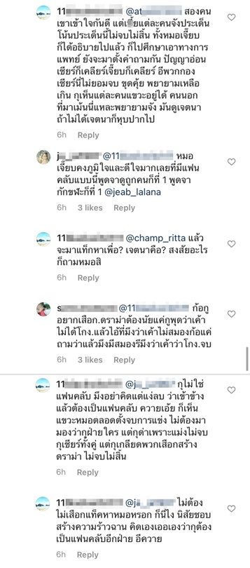 ทำเอาชาวเน็ตจำนวนมากเข้ามาคอมเมนต์ตอบโต้ว่าทำไมต้องไปว่าพี่ชายของสาวเชียร์รุนแรงขนาดนั้น ทั้งๆที่เขาถามดีๆ ก่อนขยายวงดราม่าไอจีระอุ ชาวเน็ตเถียงกันรุนแรง ถ้อยคำหยาบคายด่าทอกลางไอจีของสาวเชียร์ ก่อนสาวเชียร์จะเข้ามาคอมเมนต์ขอร้องขอให้ใช้ถ้อยคำสุภาพว่า “ขอความกรุณาคอมเม้นอย่างสุภาพนะคะ”