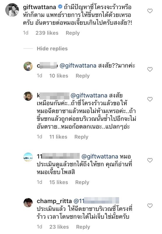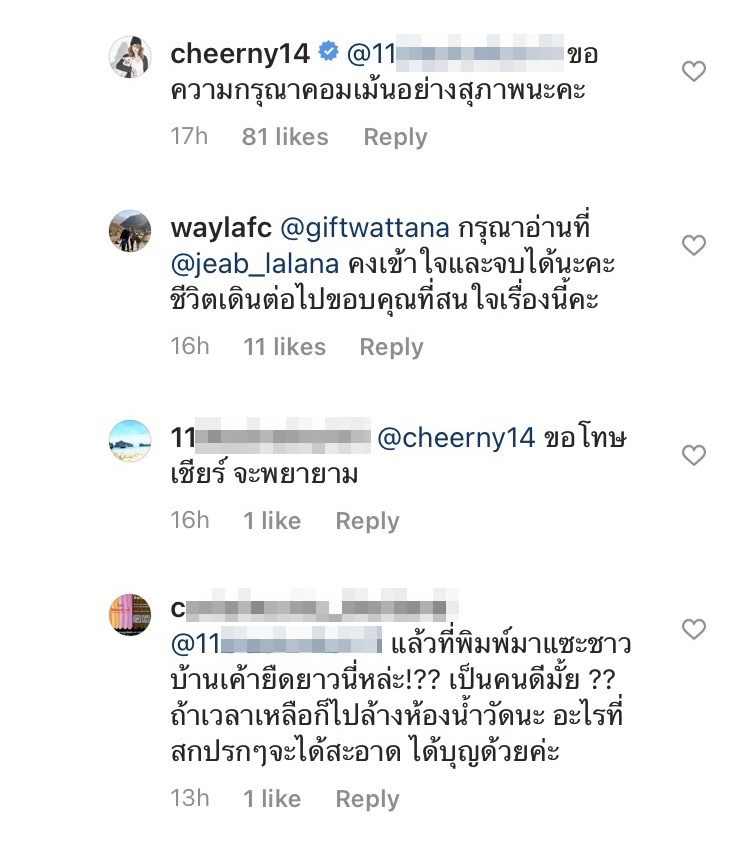 อย่างไรก็ตาม ด้านคุณแม่ของหมอเจี๊ยบ เข้ามาคอมเมนต์ตอบหนุ่มกิ๊ฟ ด้วยว่า “@giftwattana กรุณาอ่านที่ @jeab_lalana คงเข้าใจและจบได้นะคะชีวิตเดินต่อไปขอบคุณที่สนใจเรื่องนี้คะ”