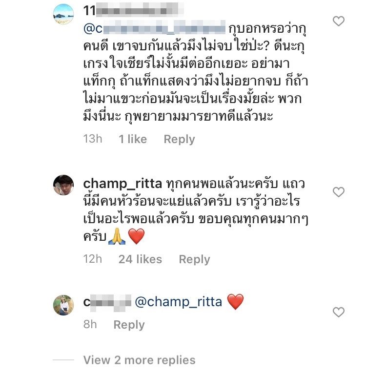 ขณะที่ แชมป์ พี่ชายของเชียร์ ก็เข้ามาขอร้องชาวเน็ตเช่นกันว่า “ทุกคนพอแล้วนะครับ แถวนี้มีคนหัวร้อนจะแย่แล้วครับ เรารู้ว่าอะไรเป็นอะไรพอแล้วครับ ขอบคุณทุกคนมากๆครับ”