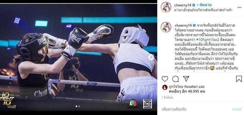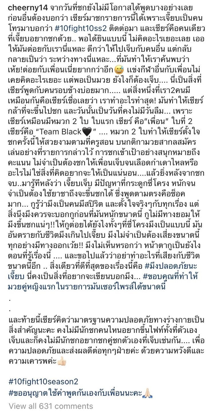 จากวันที่ชกยังไม่มีโอกาสได้พูดบางอย่างเลย ก่อนอื่นต้องบอกว่า เชียร์มาชกรายการนี้ได้เพราะเจี๊ยบเป็นคนโทรมาบอกว่า #10fight10ss2 ติดต่อมา และเชียร์คือคนเดียวที่เจี๊ยบอยากชกด้วย.. พอได้ยินแบบนี้ ไม่คิดอะไรเยอะเลย เออ ให้มันต่อยกับเรานี่แหละ ดีกว่าให้ไปเจ็บกับคนอื่น แต่กลับกลายเป็นว่า ระหว่างทางนี่แหละ…ที่มันทำให้เราค้นพบว่า เห้ย!ต่อยกับเพื่อนเนี่ยยากกว่าอีก เเข่งกีฬาอื่นกับเพื่อนไม่เคยคิดอะไรเยอะ เเต่พอเป็นมวย ยังไงก็ต้องเจ็บ…. นี่เป็นสิ่งที่เชียร์พูดกับคนรอบข้างบ่อยมาก….. แต่สิ่งหนึ่งที่เรา2คนมีเหมือนกันคือเชียร์เชื่อเลยว่า เราทำอะไรทำสุด! มันทำให้เชียร์กล้าที่จะขึ้นไปชก และวันนั้นเป็นวันที่คงไม่มีวันลืม… เพราะเชียร์เหมือนมีหมวก 2 ใบ ใบแรก เชียร์ คือ”เพื่อน” ใบที่ 2 เชียร์คือ “Team Black” …. หมวก 2 ใบทำให้เชียร์ตั้งใจชกครั้งนี้ให้สวยงามตามที่ครูสอน บนกติกามวยสากลสมัครเล่นอย่างที่รายการกล่าวไว้ การชกเข้าเป้าอย่างสนุกหมายถึงคะแนน ไม่จำเป็นต้องชกให้เพื่อนเจ็บจนเลือดกำเดาไหลหรืออะไรไม่ใช่สิ่งที่คิดอยากจะให้เป็นแน่นอน….แล้วยิ่งหลังจากชกจบ..มารู้ทีหลังว่า เจี๊ยบเจ็บ มีปัญหาที่กระดูกซี่โครง หนักจนจำเป็นต้องใช้ยาชาถึงจะขึ้นชกได้ ซึ่งพูดตามตรงคือช็อคมาก… กูรู้ว่ามึงเป็นคนมีสปิริต และตั้งใจจริงๆกับทุกเรื่อง แต่สิ่งนึงมึงควรจะบอกกูก่อนที่มันหนักขนาดนี้ กูไม่มีทางยอมให้มึงขึ้นชกแน่ๆ!!ให้กูต่อยได้ยังไงทั้งๆที่ซี่โครงมึงเป็นแบบนี้ มันอันตรายกับชีวิตมึงเกินไปเจี๊ยบ มึงไม่จำเป็นต้องเสี่ยงขนาดนี้ทุกอย่างมีทางออกเว้ย!! มึงไม่เห็นหรอกว่า หน้าตากูเป็นยังไงตอนที่รู้เรื่องนี้ …. และขอไปแล้วว่าอย่าทำอะไรที่เสียงกับชีวิตขนาดนี้อีก .. สิ่งเดียวที่ดีที่สุดของเรื่องนี้คือ #มึงปลอดภัยนะเจี๊ยบ นี่คงเป็นสิ่งที่อยากจะเขียนบอกมึง… #ขอบคุณที่ทำให้มวยคู่หญิงแรกในรายการมันเซอร์ไพรส์ได้ขนาดนี้ . . และท้ายนี้เชียร์คิดว่ามาตรฐานความปลอดภัยทางร่างกายเป็นสิ่งสำคัญนะคะ คงไม่มีนักชกคนไหนอยากขึ้นไฟท์ทั้งที่ตัวเองเจ็บและก็คงไม่มีนักชกอยากชกคู่ชกตัวเองที่เจ็บเช่นกัน…. เพื่อความปลอดภัยและส่งผลดีต่อทุกๆฝ่ายค่ะ ด้วยความหวังดีและความเคารพค่ะ #10fight10season2 #ขออนุญาตใช้คำพูดกันเองกับเพื่อนนะคะ