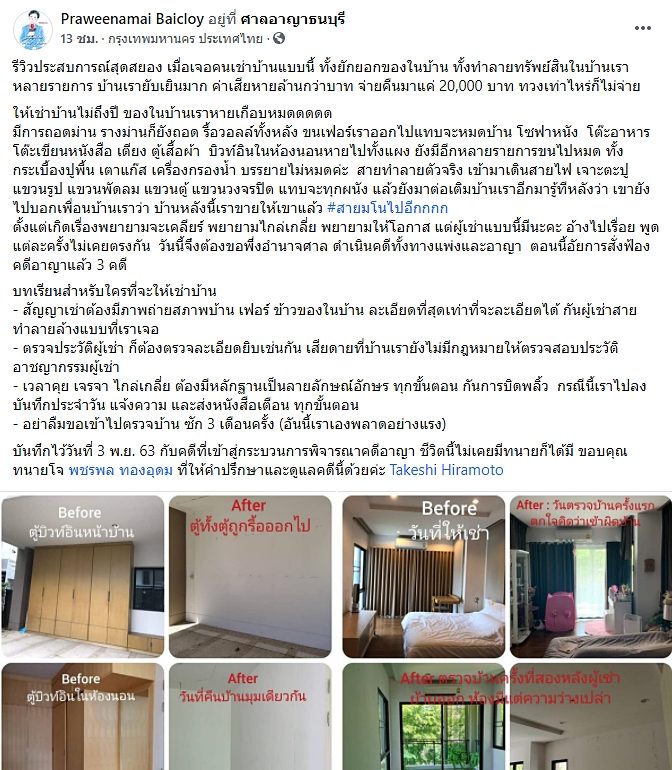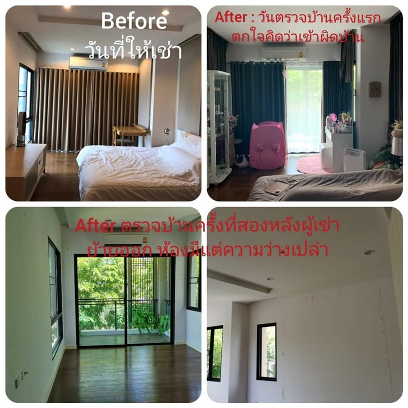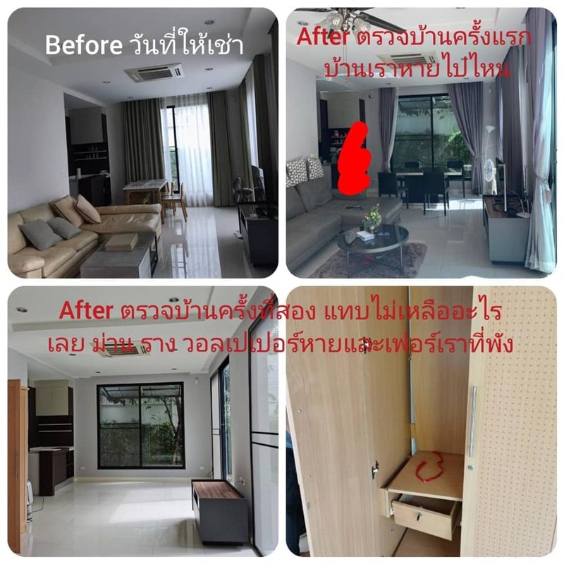 ให้เช่าบ้านไม่ถึงปี ของในบ้านเราหายเกือบหมด มีการถอดม่าน รางม่านก็ยังถอด รื้อวอลล์ทั้งหลัง ขนเฟอร์เราออกไปแทบจะหมดบ้าน โซฟาหนัง โต๊ะอาหาร โต๊ะเขียนหนังสือ เตียง ตู้เสื้อผ้า บิวท์อินในห้องนอนหายไปทั้งแผง ยังมีอีกหลายรายการขนไปหมด ทั้งกระเบื้องปูพื้น เตาแก๊ส เครื่องกรองน้ำ บรรยายไม่หมดค่ะ สายทำลายตัวจริง เข้ามาเดินสายไฟ เจาะตะปู แขวนรูป แขวนพัดลม แขวนตู้ แขวนวงจรปิด แทบจะทุกผนัง แล้วยังมาต่อเติมบ้านเราอีกมารู้ทีหลังว่า เขายังไปบอกเพื่อนบ้านเราว่า บ้านหลังนี้เราขายให้เขาแล้ว #สายมโนไปอีก