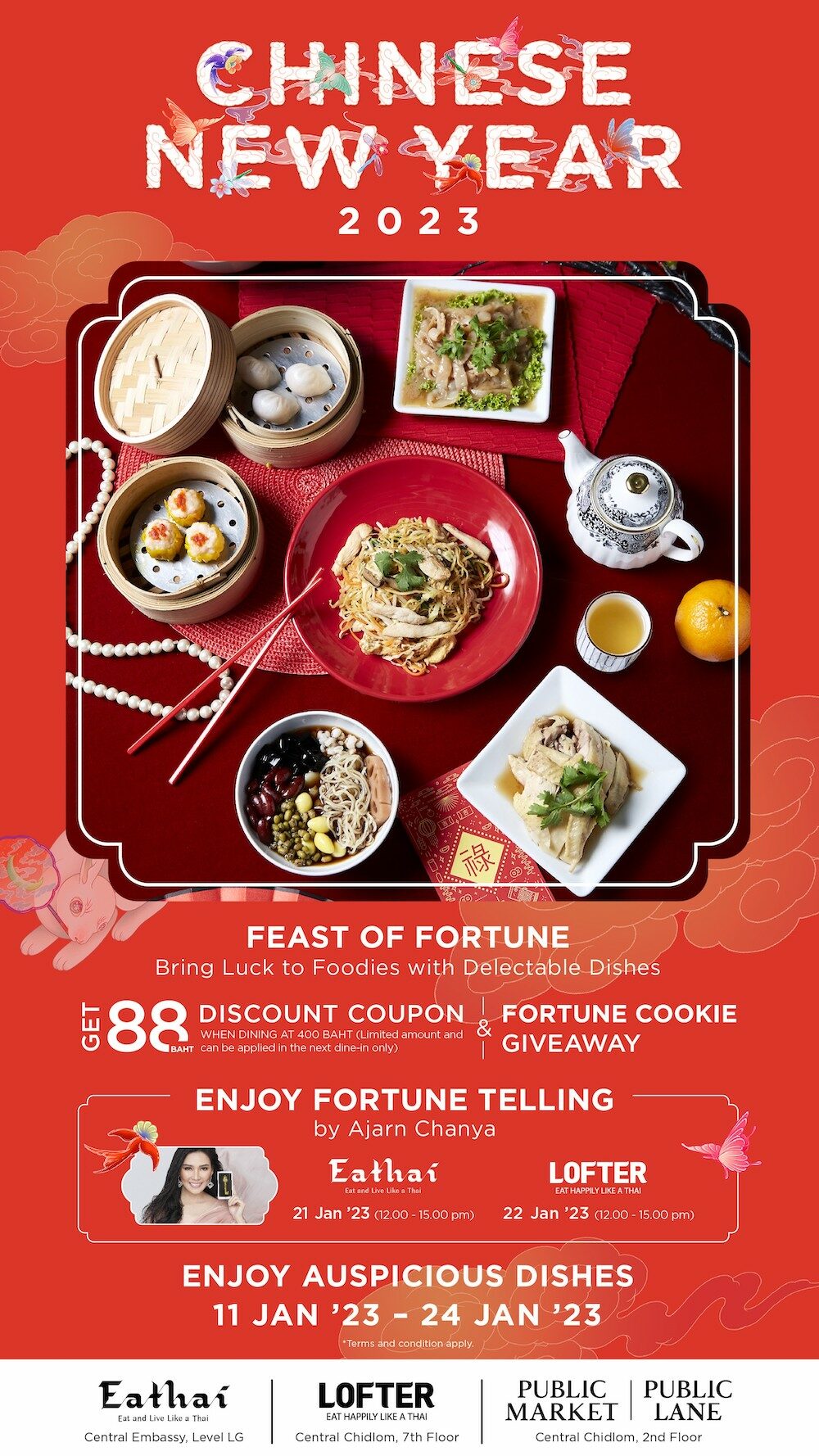 ไม่เพียงแค่เมนูเด็ดที่นำมาแนะนำเหล่า Food Lover ให้ได้ลิ้มรสความอร่อย ช่วงตรุษจีนนี้ ห้างเซ็นทรัลยังจัดกิจกรรมพิเศษให้ลูกค้า ได้เช็คดวงฟรี! กับหมอดูชื่อดัง อาจารย์ ชัญญ่า ราชินีไพ่จิตสัมผัส เมื่อรับประทานอาหารครบ 400 บาทที่ Eathai ชั้น LG ศูนย์การค้าเซ็นทรัล เอ็มบาสซี วันที่ 21 ม.ค.2566 เวลา 12.00-16.00 น. และ LOFTER @ Central Chidlom ชั้น 7 ห้างเซ็นทรัลชิดลม วันที่ 22 ม.ค.2566 เวลา 12.00-16.00 น. อีกด้วย