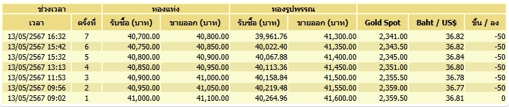 ราคาทองวันนี้ (13 พ.ค. 67) ร่วงลง 300 บาท ทองรูปพรรณ 41,300 บาท