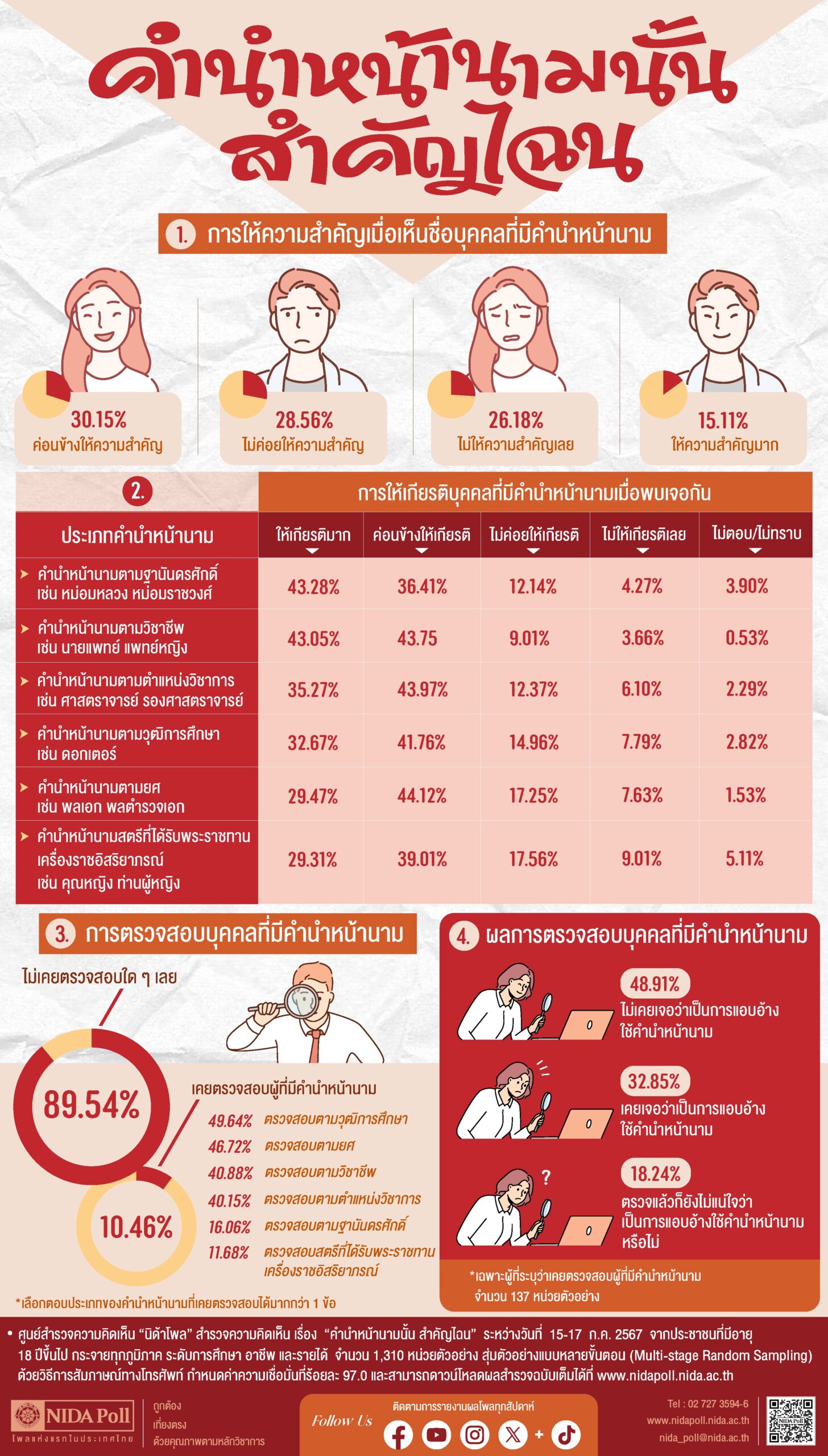 นิด้าโพลเปิดเผยผลสำรวจ “คำนำหน้าชื่อ” พบคนส่วนใหญ่ค่อนข้างให้ความสำคัญ และค่อนข้างให้เกียรติบุคคลตามคำนำหน้าชื่อ แต่คนเกือบ 90% ไม่เคยตรวจสอบที่มาคำนำหน้าชื่อ