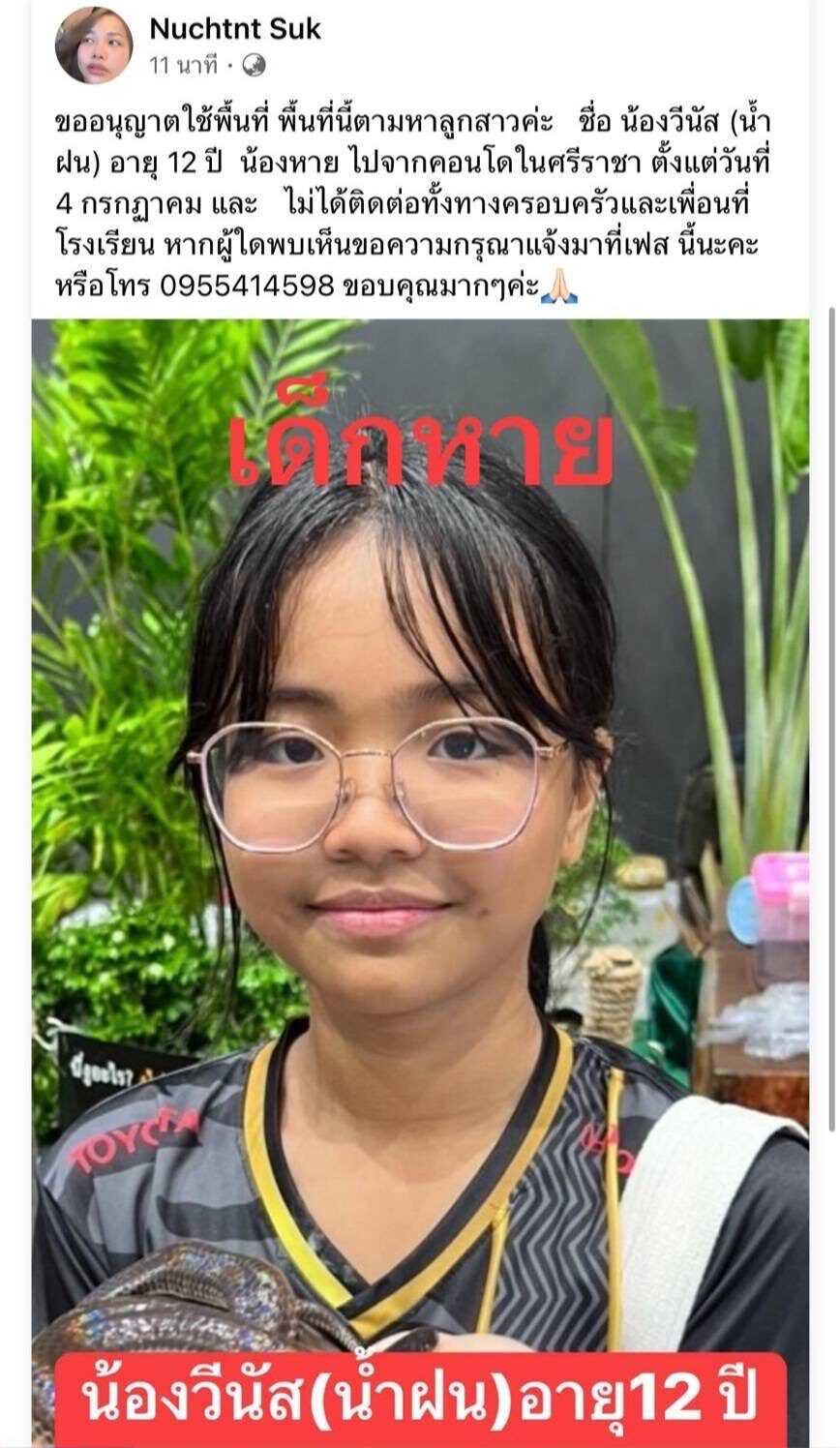 กรณีผู้ใช้เฟซบุ๊คชื่อว่า Nuchtnt Suk โพสต์ข้อความว่า ” ขออนุญาตใช้พื้นที่ พื้นที่นี้ตามหาลูกสาวค่ะ ชื่อ น้องวีนัส (น้ำฝน) อายุ 12 ปี น้องหาย ไปจากคอนโดในศรีราชา ตั้งแต่วันที่ 4 กรกฎาคม และ ไม่ได้ติดต่อทั้งทางครอบครัวและเพื่อนที่โรงเรียน หากผู้ใดพบเห็นขอความกรุณาแจ้งมาที่เฟส นี้นะคะหรือโทร 0955414598 ขอบคุณมากๆค่ะ “