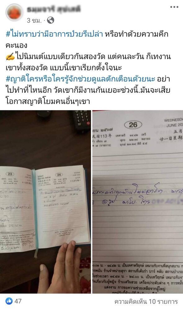 ความคืบหน้า เมื่อวันที่ 27 มิ.ย.67 ผู้สื่อข่าวเดินทางไปที่ วัดสำนักบก หมู่ 2 ต.สำนักบก อ.เมือง จ.ชลบุรี พบกับพระอาจารย์ไพบูลย์ สุเมโธ เจ้าอาวาสวัดสำนักบก นำสมุดโน้ตนัดหมายมาให้ผู้สื่อข่าวดูพร้อมกับเล่าให้ผู้สื่อข่าวฟังว่า ตามปกติถ้าโยมมานิมนต์ก็จะจดไว้ และพอถึงวันไม่มารับ พอติดต่อและโทรไปก็ไม่รับ จากนั้นก็ให้คนขับรถพาไปที่บ้านดังกล่าวพบว่ารปภ.ไม่แจ้งว่ามีบ้านไหนทำบุญเลย