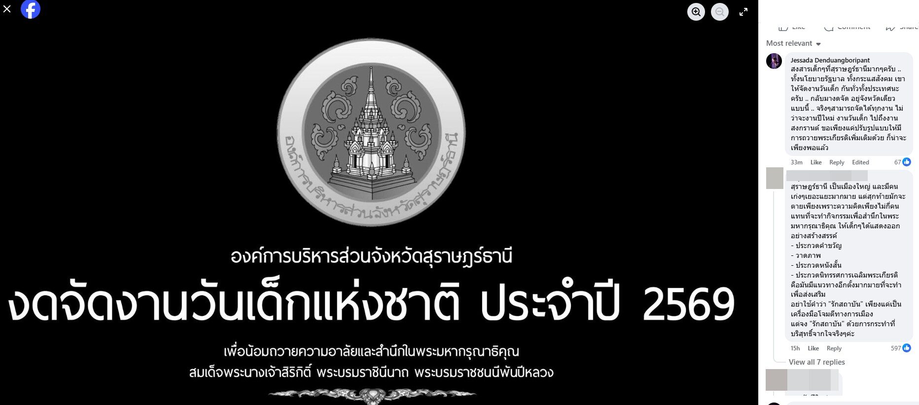 สังคมออนไลน์วิพากษ์วิจารณ์ การประกาศงดจัดกิจกรรมวันเด็ก ของ องค์การบริหารส่วนจังหวัดสุราษฎร์ธานี หลังโพสต์ข้อความ ระบุว่า องค์การบริหารส่วนจังหวัดสุราษฎร์ธานี ขอแจ้งงดการจัดงานวันเด็กแห่งชาติ ประจำปี 2569
