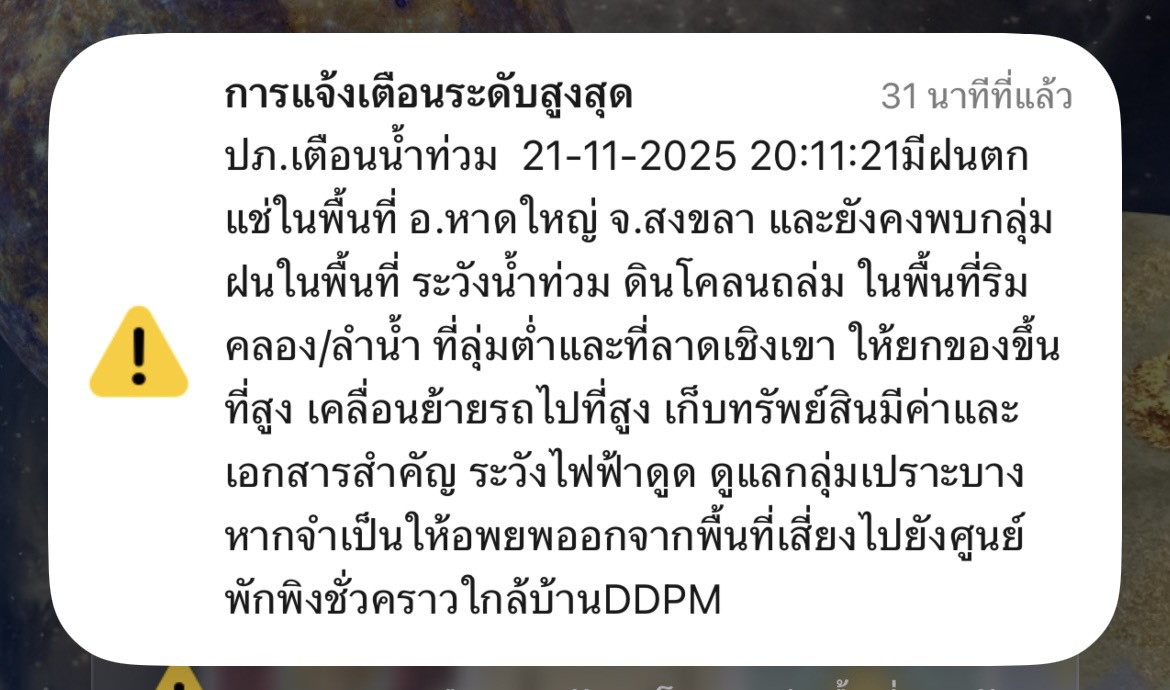 ขณะที่ ปภ. ส่ง Cell Broadcast แจ้งเตือนน้ำท่วม อ.หาดใหญ่ จ.สงขลา มากถึง 3 ครั้ง เนื่องจากมีฝนตกสะสมกว่า 3 วัน จึงได้แจ้งเตือนประชาชนที่ลุ่มต่ำ ที่ลาดเชิงเขา ให้ยกของขึ้นที่สูง เคลื่อนย้ายรถ ดูแลกลุ่มเปราะบาง หากจำเป็นให้อพยพไปศูนย์พักพิงฯ