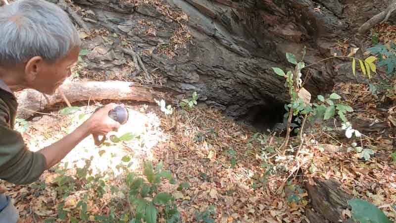 เมื่อไปถึง พบถ้ำดังกล่าวมีลักษณะเป็นโพรงหิน อยู่ใต้ต้นตะคร้ำขนาดใหญ่ ภายในถ้ำมีแผ่นไม้กระดานวางพาดปากหลุมลึกลงไปอีก ข้างในมืดสนิท ต้องใช้ไฟฉายส่อง และเป็นที่อาศัยของค้างคาว สภาพทางลงลาดชันและลื่นมาก ไม่สามารถเดินลงลึกเข้าไปได้ เพราะอาจเกิดอันตราย