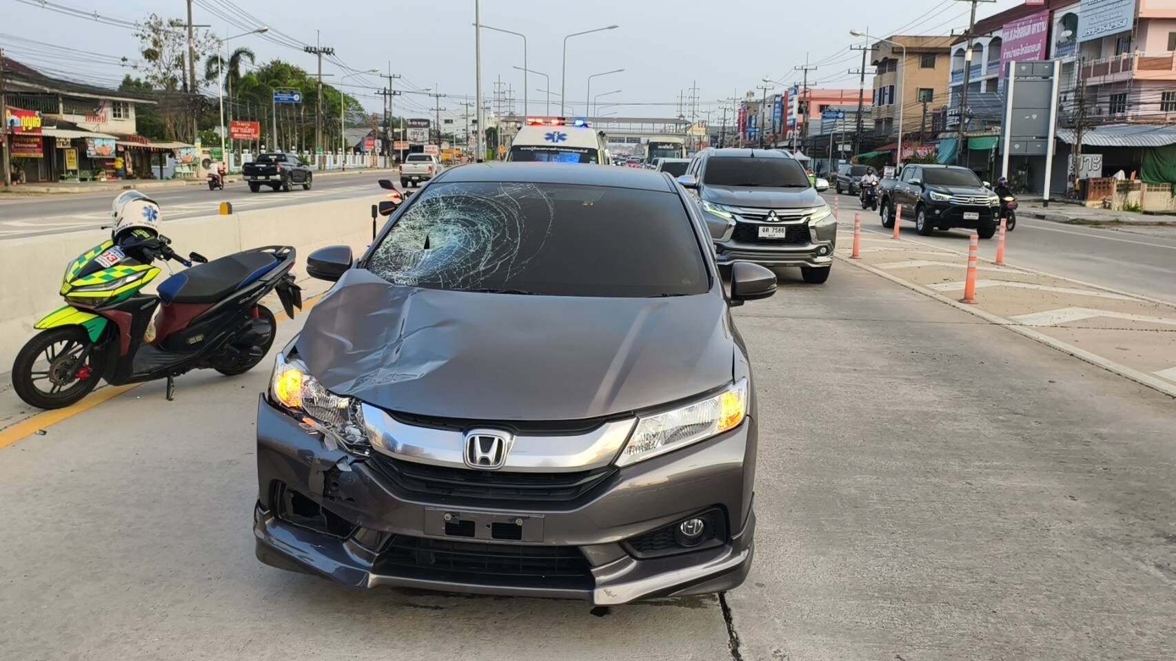 ใกล้กันพบ รถเก๋ง ฮอนด้า ซิตี้ สีบรอนซ์เทา ทะเบียนชลบุรี จอดอยู่ในที่เกิดเหตุ ด้านหน้ารถมีร่องรอยการชนได้รับความเสียหาย น.ส.รัตติรส (สงวนนามสกุล) คนขับ ยืนรอให้การในที่เกิดเหตุ