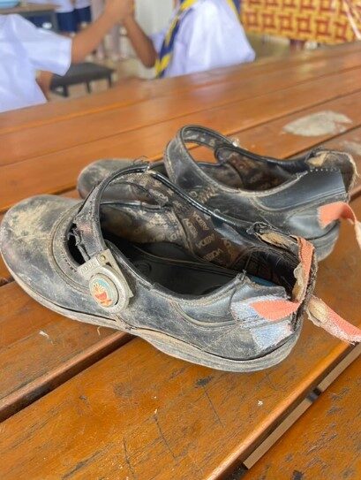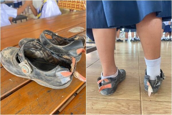 ครูเล่าว่า จะมีนักเรียนสักกี่คนที่ไม่มีรองเท้าใหม่ได้ใส่เหมือนเพื่อนๆ ช่วง 12.00 น. ไปกินข้าวที่โรงอาหาร เลยมองไปเห็นเด็กนักเรียนหญิงคนหนึ่ง ที่ยืนรอถาดข้าวอยู่ ชุดนักเรียนก็ดำ เปื้อนไปหมด ถุงเท้าก็ใส่มาคนละข้างไม่เท่ากัน มองดูรองเท้า ถึงกับต้องเดินเข้าไปถามว่า รองเท้าหนูใส่มานานหรือยัง น้องบอกนานแล้ว รองเท้ามันเล็ก หนูเลยทับส้นใส่ จึงทำให้รองเท้าแตกขาดตามภาพที่เห็น