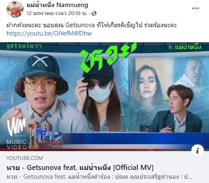 เน็ตไอดอลวงการหวย แม่น้ำหนึ่ง ภิรดา นักให้แนวทางเลขเด็ด โพสต์ขอบคุณนักร้องวงดัง หลังไปร่วมฟีเจอริ่ง เพลง หวย เพลงใหม่ของ เก็ตสึโนวา ว่าฝากด้วยนะคะ ขอบคุณ Getsunova ที่ให้เกียรติเชิญไป ร่วมร้องนะคะ