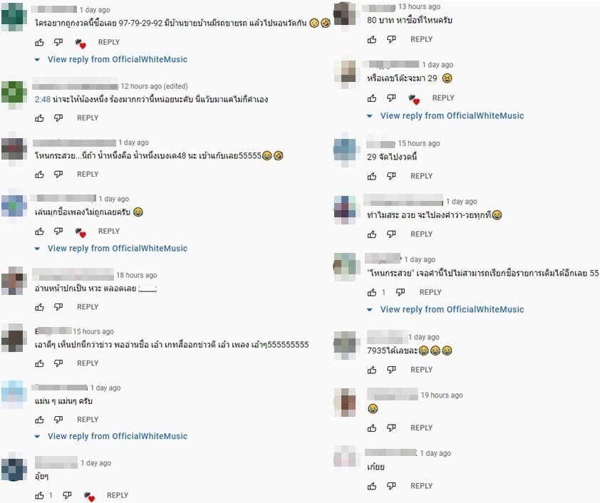 แฟนเพลงและแฟนหวยเข้ามาแสดงความคิดเห็นจำนวนมาก อาทิ ถ้างวด 17 Jan 2022 ออกเลข 7395 นี่คือ ฮา มากเลยนะ งานผ้าสามสีและหัวหมู นางรำเตรียมถวายเลยนะครับ , ใครอยากถูกงวดนี้ซื้อเลย 97-79-29-92 มีบ้านขายบ้านมีรถขายรถ แล้วไปนอนวัดกัน , หรือเลขโต๊ะจะมา 29 , 29 จัดไปงวดนี้ , 429 ต้องมา , แม่น้ำหนึ่งเสียงดีว่าไม่ได้นะ เป็นต้น