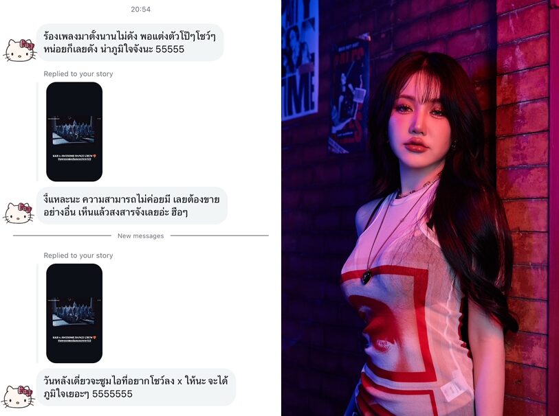 พร้อมกับโพสต์รูปที่มีคน DM มาหาเธอผ่านทางอินสตาแกรม "ร้องเพลงมาตั้งนานไม่ดัง พอแต่งตัวโป๊ๆโชว์ๆ หน่อยก็เลยดัง น่าภูมิใจจังนะ 55555 งี้แหละนะ ความสามารถไม่ค่อยมี เลยต้องขายอย่างอื่น เห็นแล้วสงสารจังเลยอ่ะ ฮือๆ วันหลังเดี๋ยวจะซูมไอที่อยากโชว์ลง x ให้นะ จะได้ ภูมิใจเยอะๆ 5555555"