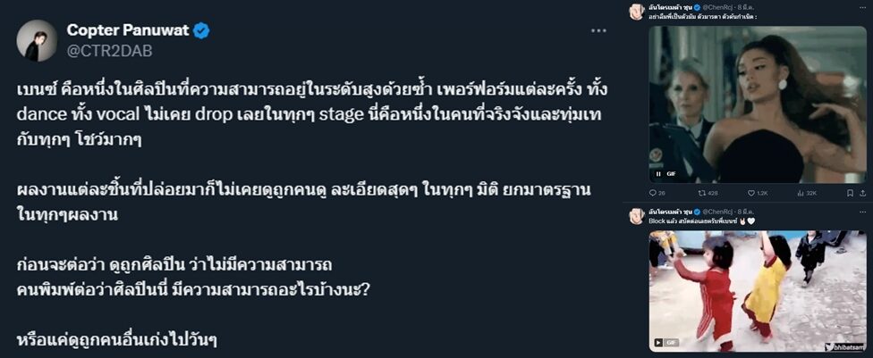 ไม่เว้นแม้แต่นักแสดงดัง "จุง อาเชน" ก็เข้ามาคอมเมนต์ บอกว่า "อย่าลืมพี่เป็นตัวมัม ตัวมารดา ตัวต้นกำเนิด Block แล้ว สบัดต่อเลยครับพี่เบนซ์" หรือ "คอปเตอร์ ภานุวัฒน์" ก็คอมเมนต์บอกว่า "เบนซ์ คือหนึ่งในศิลปินที่ความสามารถอยู่ในระดับสูงด้วยซ้ำ เพอร์ฟอร์มแต่ละครั้ง ทั้ง dance ทั้ง vocal ไม่เคย drop เลยในทุกๆ stage นี่คือหนึ่งในคนที่จริงจังและทุ่มเทกับทุกๆ โชว์มากๆ