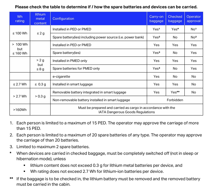 - หากแบตเตอรี่สำรองมีขนาดความจุ ไม่เกิน 100 Wh (Watt-Hour) หรือ 20,000 mAh (milli ampere-hour) ผู้โดยสารสามารถนำติดตัวขึ้นเครื่องได้คนละไม่เกิน 20 ชิ้น