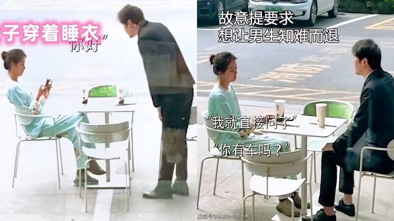 เหตุการณ์เกิดขึ้นนอกร้านขายเครื่องดื่มในมณฑลส่านซี ผู้หญิงคนนั้นสวมชุดนอนธรรมดาและรออยู่ที่นั่นแต่เช้า เธอแค่ต้องการดื่มชานมให้เสร็จและการนัดบอดก็จะสิ้นสุดลง คงจะดีที่สุด ถ้าชายที่นัดบอดจะหันหลังกลับไปโดยไม่พูดอะไรสักคำเมื่อเห็นเธอแต่งตัวแบบนี้