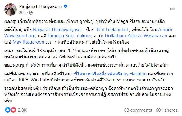 ล่าสุดผู้ใช้บัญชีเฟซบุ๊ก Panjanat Thaiyakorn หรือ อิ๋ว Necross Melphist ซึ่งเป็น 1 ใน 7 รายของที่อยู่ในเหตุการณ์และเป็นโจทก์ยื่นฟ้องคู่แฝดพ่อค้ามาเฟีย โพสต์เฟซบุ๊กแจ้งว่า ผลสรุปเกี่ยวกับคดีความที่ผมและเพื่อนๆ ถูกข่มขู่, ขู่ฆ่าที่ห้าง Mega Plaza สะพานเหล็ก
