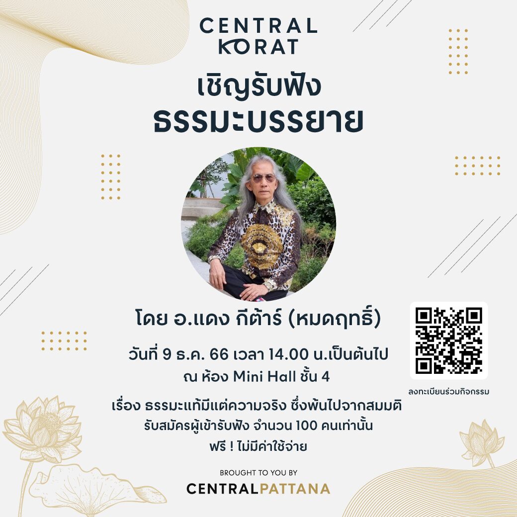 โดยงานจัดขึ้น ณ ห้อง Mini Hall ชั้น 4 เซ็นทรัล โคราช (Central Korat) ซึ่งรับจำนวน 100 ท่าน เท่านั้น ทั้งนี้ผู้ที่สนใจเข้าร่วมฟังธรรมะบรรยาย สามารถลงทะเบียนผ่าน คิวอาร์โค้ด ที่โพสต์ใน Facebook : Central Korat เข้าร่วมฟรี ไม่มีค่าใช้จ่าย