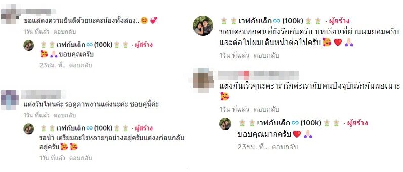 ขณะที่ เวฟ โพสต์คลิป (ชมคลิป) ตัวเองและพี่เล็กใส่ชุดไทย ออร่าบ่าวสาว มีแฟนๆมาเชียร์คู่สร้างคู่สม พร้อมสอบถามแต่งวันไหน เวฟ ได้ตอบว่า “รอน้า เตรียมอะไรหลายๆอย่างอยู่ครับแต่งก่อนกลับ อยู่ครับ”