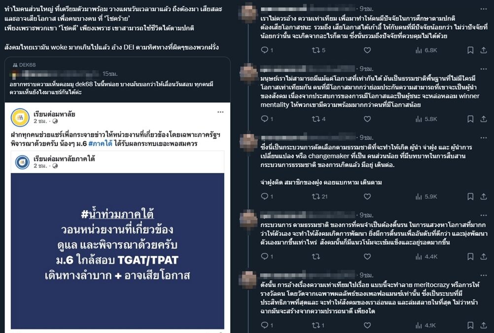 สังคมไทยเรามัน woke มากเกินไปแล้ว อ้าง DEI ตามทิศทางที่ผิดๆของพวกฝรั่ง เราไม่ควรอ้าง ความเท่าเทียม เพื่อมาทำให้คนมีปัจจัยในการศึกษาตามปกติ