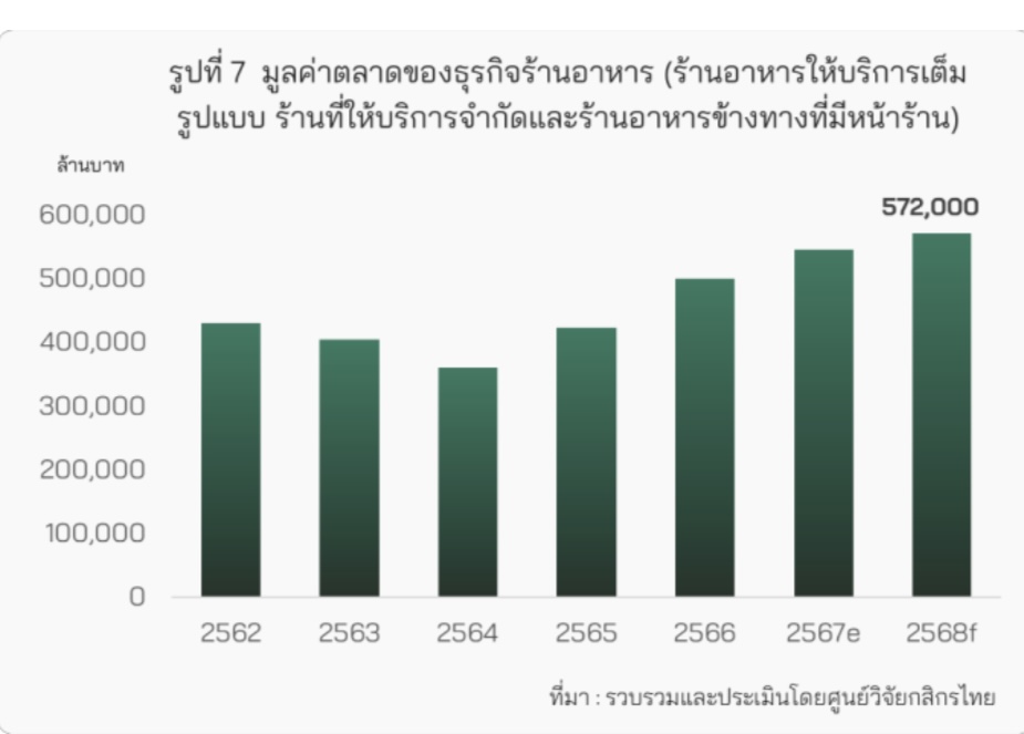 โดยในปี 2568 คาดว่าร้านอาหารและเครื่องดื่มจะมีจำนวนประมาณ 6.9 แสนร้าน และมีมูลค่าตลาดประมาณ 572,000 ล้านบาท เติบโต 4.8%