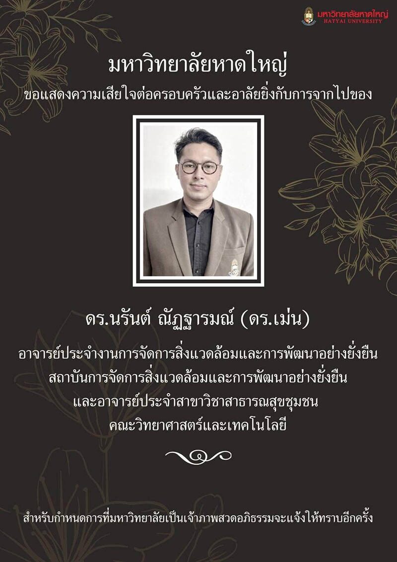 วันที่ 30 พ.ย. 2567 เพจดัง Drama-addict ได้เผยแพร่คลิปวิดีโอขณะอาจารย์มหาวิทยาลัยถูกไฟดูดเสียชีวิต จากเหตุการณ์น้ำท่วมที่ อ.หาดใหญ่ โดยระบุข้อความว่า จากเหตุการณ์ ดร.นรันต์ ณัฏฐารมณ์ (ดร.เม่น) อาจารย์ประจำงานการจัดการสิ่งแวดล้อมและการพัฒนาอย่างยั่งยืน สถาบันการจัดการสิ่งแวดล้อมและการพัฒนาอย่างยั่งยืน และอาจารย์สาขาวิชาสาธารณสุขชุมชน คณะวิทยาศาสตร์และเทคโนโลยี มหาวิทยาลัยหาดใหญ่ เสียชีวิตในเหตุการณ์น้ำท่วมนี้