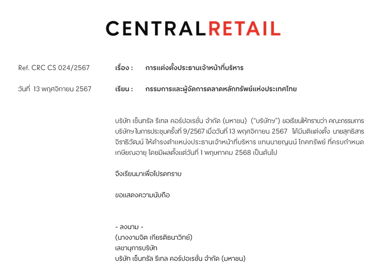 ผู้สื่อข่าวรายงานว่า บริษัท เซ็นทรัล รีเทล คอร์ปอเรชั่น จำกัด (มหาชน) แจ้งต่อตลาดหลักทรัพย์แห่งประเทศไทย เมื่อวันที่ 13 พฤศจิกายน 2567 ระบุว่า บริษัทฯ ขอเรียนให้ทราบว่า คณะกรรมการบริษัทฯ ในการประชุมครั้งที่ 9/2567 เมื่อวันที่ 13 พฤศจิกายน 2567 ได้มีมติแต่งตั้ง นายสุทธิสาร จิราธิวัฒน์ ให้ดำรงตำแหน่งประธานเจ้าหน้าที่บริหาร แทนนายญนน์ โกคทรัพย์ ที่ครบกำหนดเกษียณอายุ โดยมีผลตั้งแต่วันที่ 1 พฤษภาคม 2568 เป็นต้นไป