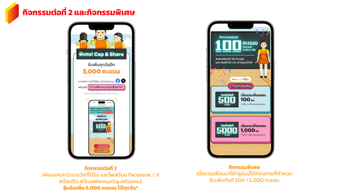 พร้อมลุ้นรับคะแนนได้ถึง 3 ต่อผ่านรางวัลและภารกิจพิเศษแบบเต็มพิกัด รางวัลต่อที่ 1 ลุ้นหมุนวงล้อสุ่มรับคะแนนตั้งแต่ 0 - 100 คะแนน รางวัลต่อที่ 2 เพียงแคปหน้ารางวัลที่ได้รับ และโพสต์ลง Facebook หรือ X ส่วนตัว เปิดเป็นสาธารณะ (Public) พร้อมติด #TrueMoneyxSquidGame2 รับสิทธิ์ลุ้นสุ่มแจกรางวัล 5,000 คะแนนทุกวัน โดยจะประกาศผู้โชคดีผ่านแอป TrueMoney และ Facebook Page: TrueMoney รางวัลต่อที่ 3 ผ่านภารกิจพิเศษ เมื่อชวนเพื่อนเข้าแก๊งร่วมภารกิจครบ 100 คน รับ 500 คะแนน และ ชวนเพื่อนครบ 1,000 คน รับ 5,000 คะแนน ตลอดระยะเวลาแคมเปญฯ