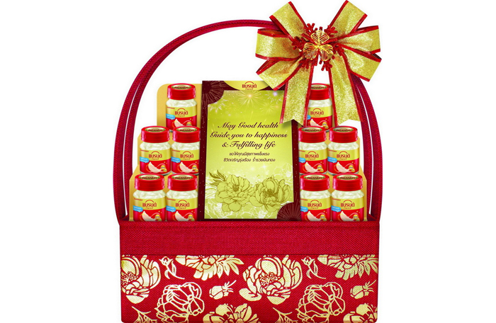 1. กระเช้าแบรนด์พรีเมียม เปลี่ยนเป็น “กระเป๋าผ้าลายดอกโบตั๋นพร้อมกระเป๋าด้านหน้า” ดีไซน์เก๋ลวดลายดอกโบตั๋น ออกแบบโดย Janfive Studio มีให้เลือก 5 แบบ ได้แก่ กระเช้าแบรนด์รังนกแท้ สูตรคลาสสิก น้ำตาลกรวด, กระเช้าแบรนด์รังนกแท้ สูตรไซลิทอล ไม่มีน้ำตาล, กระเช้าแบรนด์ซุปไก่สกัด-แบรนด์รังนกแท้ สูตรคลาสสิก น้ำตาลกรวด, กระเช้าแบรนด์รังนกแท้ สูตรถั่งเช่าสีทอง และ กระเช้าแบรนด์ซุปไก่สกัด
