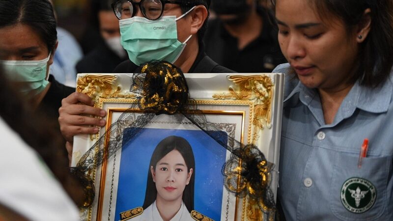 โดยทันทีที่ร่างของผู้เสียชีวิตมาถึง เจ้าหน้าที่ได้ให้ญาติทั้ง 4 ร่าง ถือกรอบรูปและกระถางธูปมาที่ขบวนรถส่งศพ ท่ามกลางบรรยากาศสุดสลดเสียงร่ำไห้ดังระงมไปทั่วทั้งอาคาร ญาติบางคนเป็นลมล้มลงไป ทีมแพทย์ต้องช่วยกันพยุงแล้วให้ดมแอมโมเนีย พร้อมทั้งนำรถเข็นวีลแชร์มาให้นั่ง