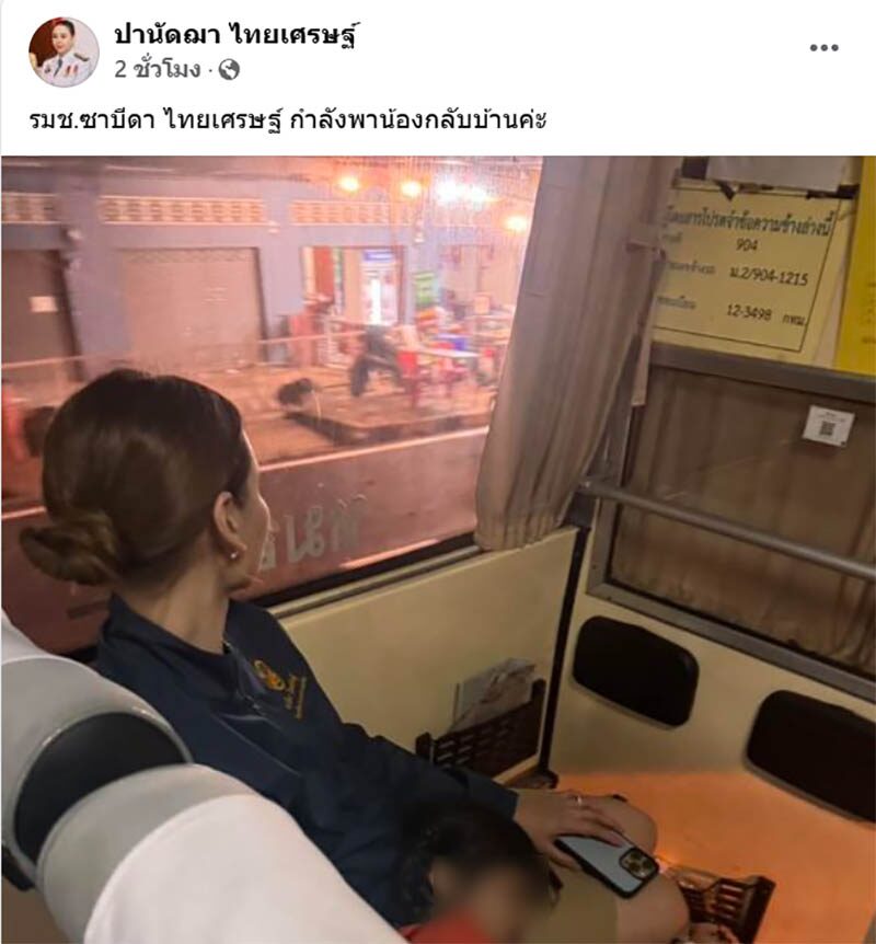 ขณะที่ น.ส.ปานัดฌา ไทยเศรษฐ์ นายกเทศมนตรีเมืองอุทัยธานี ได้โพสต์เฟซบุ๊กเป็นภาพ น.ส.ซาบีดา ไทยเศรษฐ์ รัฐมนตรีช่วยว่าการกระทรวงมหาดไทย ขณะนั่งอยู่ในรถบัสของบขส. พร้อมกับเด็กนักเรียนหญิงที่รอดชีวิตจากเหตุการณ์รถบัสไฟไหม้ ซึ่งนอนหนุนตัก น.ส.ซาบีดา พร้อมระบุข้อความว่า "รมช.ซาบีดา ไทยเศรษฐ์ กำลังพาน้องกลับบ้านค่ะ"