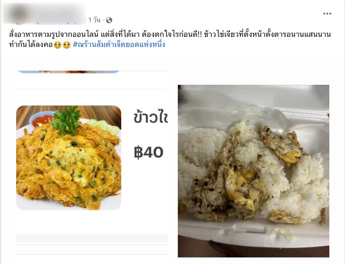 โดยโพสต์ระบุว่า“สั่งอาหารตามรูปจากออนไลน์ แต่สิ่งที่ได้มา ต้องตกใจไรก่อนดี!! ข้าวไข่เจียวที่ตั้งหน้าตั้งตารอนานแสนนาน ทำกันได้ลงคอ#ณร้านส้มตำเจ็ดยอดแห่งหนึ่ง"
