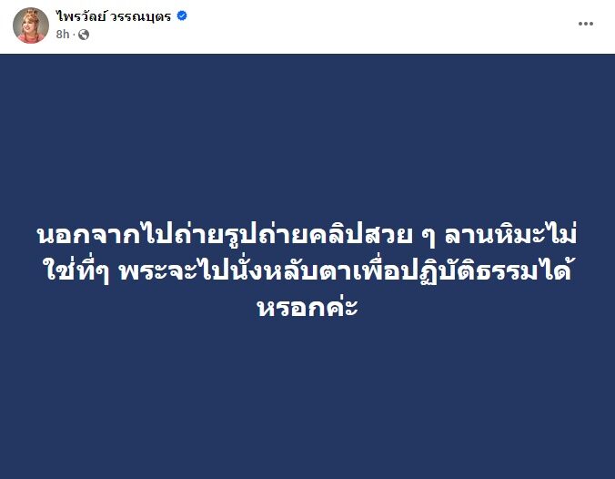 ด้าน “แพรรี่ ไพรวัลย์ วรรณบุตร” อดีตพระมหาชื่อดัง โพสต์ข้อความผ่านทางเฟซบุ๊กวิจารณ์ในเรื่องดังกล่าว ระบุว่า นอกจากไปถ่ายรูปถ่ายคลิปสวย ๆ ลานหิมะไม่ใช่ที่ๆ พระจะไปนั่งหลับตาเพื่อปฏิบัติธรรมได้หรอกค่ะ