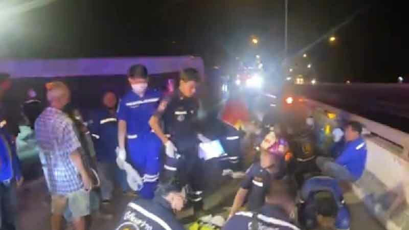 ระทึกกลางสะพานข้ามแยก รถบัสถูกชนคว่ำ พนักงานกระเด็นเกลื่อนถนน รถตามมาเบรกไม่ทันเหยียบสาหัส9