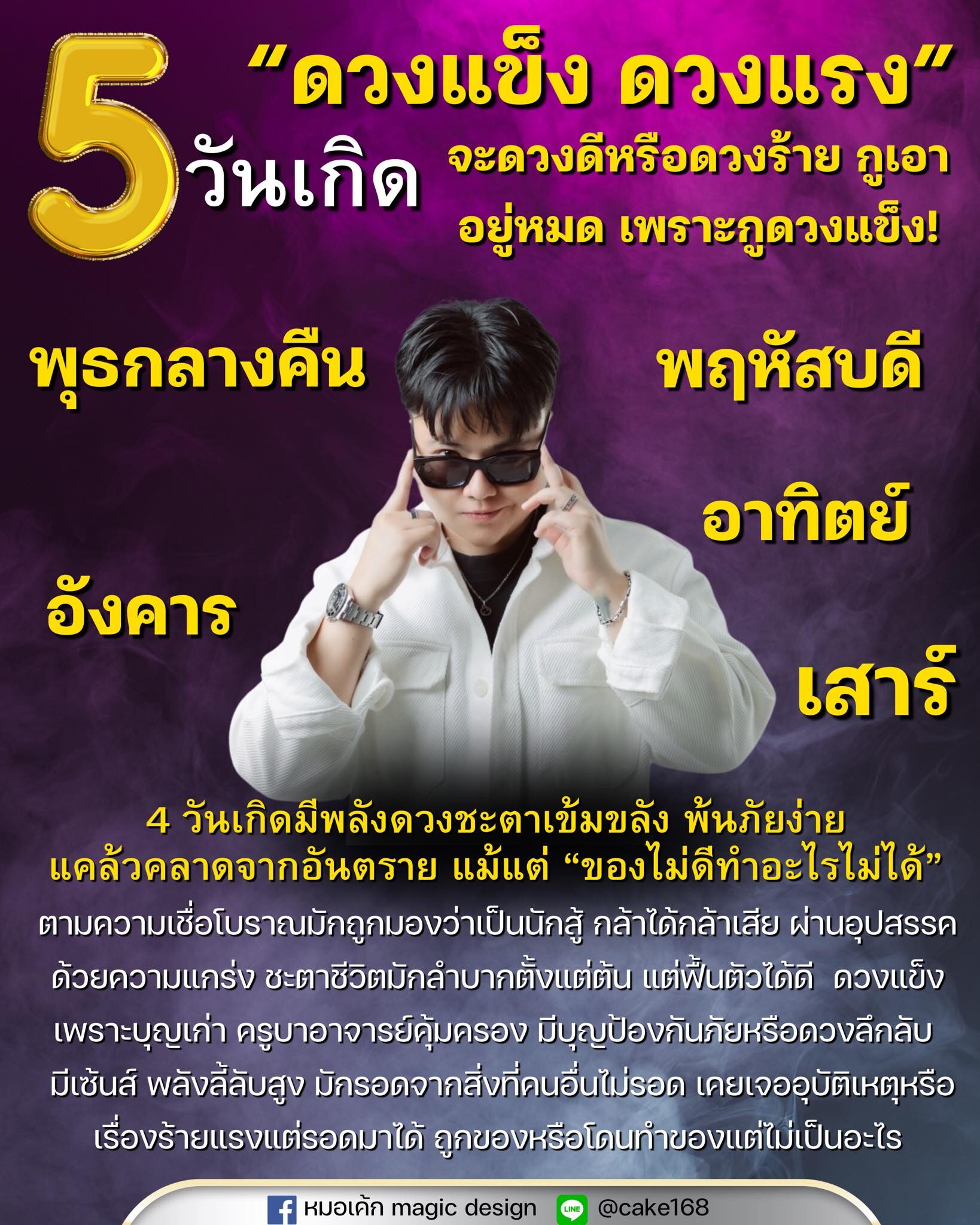 หมอเค้กMagicdesign เผยถึงดวงชะตาวันเกิด ดวงแข็งดวงแรง จะดวงดีหรือดวงร้ายเอาอยู่หมด เพราะดวงแข็ง 5 วันเกิดมีพลังดวงชะตาเข็มขลัง พ้นภัยง่าย แคล้วคลาดจากอันตราย กล้าได้กล้าเสีย ผ่านอุปสรรคด้วยความแกร่ง ชะตาชีวิตมักลำบากตั้งแต่ต้น แต่ฟื้นตัวได้ดี ดวงแข็งเพราะบุญเก่า ครูบาอาจารย์คุ้มครอง มีบุญป้องกันภัยหรือดวงลึกลับ มักรอดจากสิ่งที่คนอื่นไม่รอด เคยเจออุบัติเหตุหรือเรื่องร้าย แต่รอดมาได้