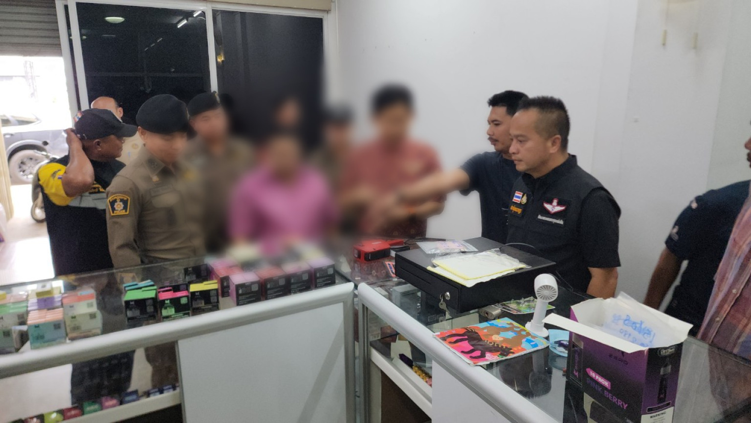 ตรวจค้นภายในร้าน พบตู้กระจกภายในบรรจุบุหรี่ไฟฟ้า และน้ำยาบุหรี่ไฟฟ้ายี่ห้อต่างๆ เป็นจำนวนมาก ที่บริเวณชั้น 2 ของบ้านยังพบลังกระดาษซึ่งภายในบรรจุอุปกรณ์การสูบ หัวพอต น้ำยาบุหรี่ไฟฟ้า และบุหรี่ไฟฟ้าพร้อมสูบอีกจำนวนมากมูลค่ารวมกว่า 500,000 บาท บริเวณรอบบ้านติดกล้องวงจรปิด ทั้งด้านหน้าและด้านหลัง จำนวนหลายตัว ส่วนเจ้าของร้านได้หลบหนีไปก่อนหน้าที่เจ้าหน้าที่ตำรวจจะเข้าไป