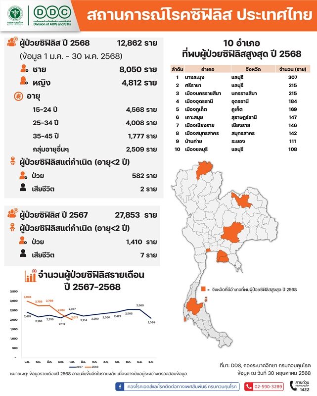อ่านข่าวต้นฉบับได้ที่ : เปิด 10 อำเภอ เจอผู้ป่วย โรคซิฟิลิส สูงสุด ยอดสะสมกว่า 12,000 คน