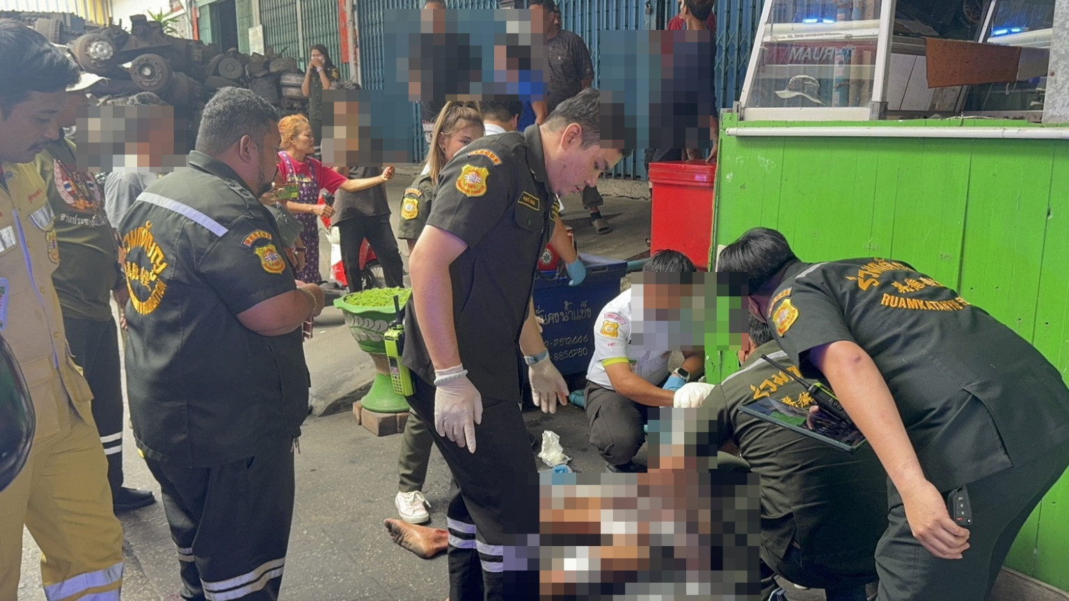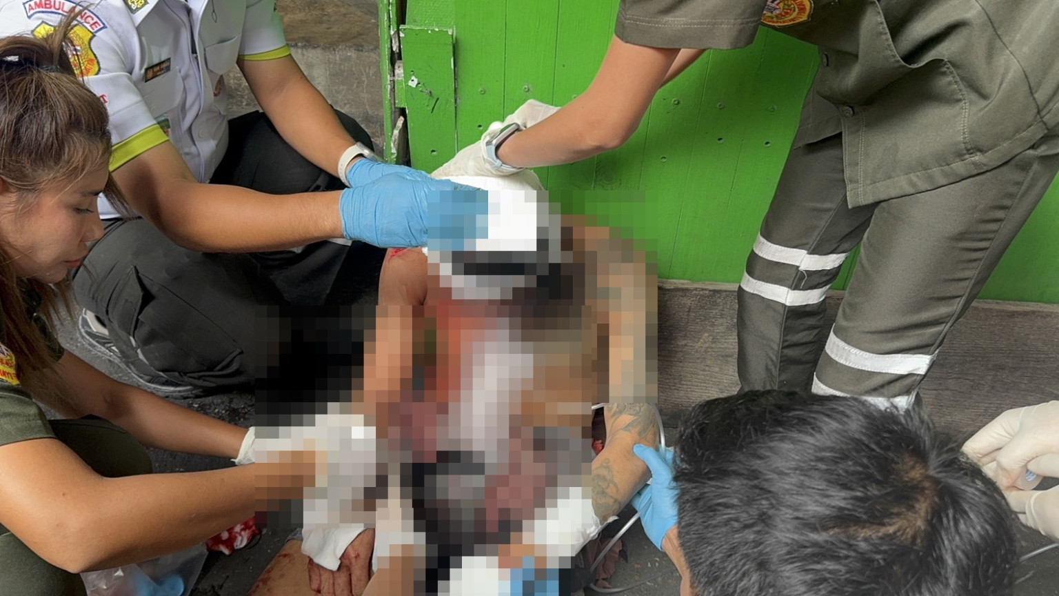 ที่หน้าตึกแถวหลังหนึ่งช่วงกลางซอย พบ นาย จีรพันธ์ หรือเจมส์ อายุ 28 ปี นั่งพิงกำแพง สภาพเลือดเต็มทั่วร่าง หายใจโรยริน มีแผลฉีกขาดจากการถูกของมีคมฟัน ที่ศีรษะ หลัง แขน และขา ไม่ต่ำกว่า 20 แผล เจ้าหน้าที่มูลนิธิให้การช่วยเหลือปฐมพยาบาลเบื้องต้น พร้อมประสานเจ้าหน้าที่กู้ชีพโรงพยาบาลบางพลีเข้าร่วมให้การช่วยเหลือ และนำส่งโรงพยาบาลบางพลี