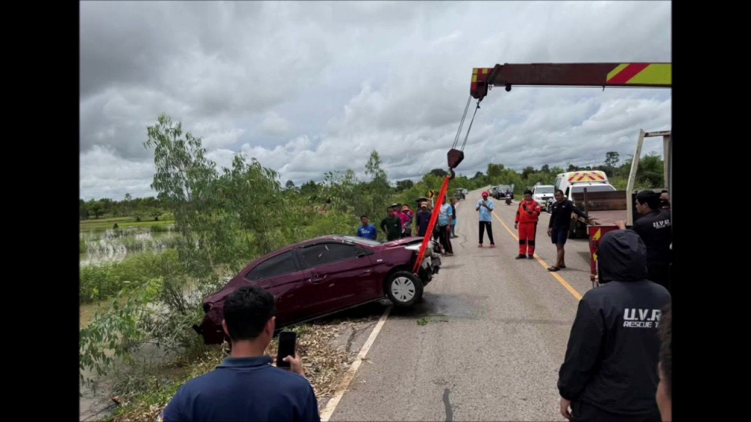 ขณะที่ทางวีอาร์กู้ภัยได้นำรถเครนลากรถเก๋งมิตซูบิชิมิราจสีเม็ดมะขาม ไม่ทราบหมายเลขทะเบียนขึ้นมาจากหนองน้ำที่ลึกประมาณ 3 เมตรขึ้นมาได้สำเร็จ สภาพรถพังยับเยิน และนำรถฯส่งยังบ้านคนเจ็บที่บ้านนาคำวังไว้ก่อน ทราบชื่อคนขับคร่าวๆ เป็นผู้หญิงชื่อว่าต้า เป็นคนบ้านนาคำวัง ต.นาคำ อ.บ้านดุง โดยก่อนเกิดเหตุทราบว่า น.ส.ต้าได้พาลูกชายวัย 2 ขวบขับรถเล่นไปตามถนนสายบ้านนาคำวัง-บ้านดอนขี้เหล็ก ก่อนเกิดเหตุมีรถกระบะที่วิ่งแหกโค้งสวนมา จึงหักหลบและตกลงไปหนองน้ำข้างทาง จนมีพลเมืองดีเข้าไปช่วยนำแม่และลูกออกมาจากรถเก๋งได้รอดตายหวุดหวิดก่อนรถจะจม