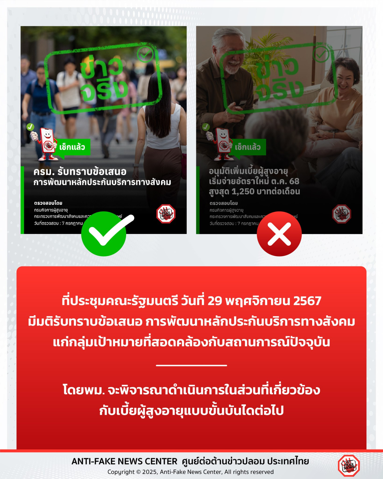 3. เมื่อวันที่ 4 กรกฎาคม 2568 เวลา 17.33 น. ทางศูนย์ฯ ได้รับข้อมูลจากกรมกิจการผู้สูงอายุ ดังนี้ "เนื่องจากมีการเผยแพร่ข่าวในสื่อออนไลน์ เรื่อง ครม. อนุมัติเพิ่มเบี้ยผู้สูงอายุ เริ่มจ่ายอัตราใหม่ ตุลาคม 2568 สูงสุด 1,250 บาทต่อเดือน จากการตรวจสอบพบว่า เป็นข่าวจริง เนื่องจากที่ประชุมคณะรัฐมนตรี วันที่ 29 พฤศจิกายน 2567 ได้รับทราบข้อเสนอ การพัฒนาหลักประกันบริการทางสังคมแก่กลุ่มเป้าหมายที่สอดคล้องกับสถานการณ์ปัจจุบัน ตามที่คณะกรรมการส่งเสริมการจัดสวัสดิการสังคมแห่งชาติ (ก.ส.ค.) เสนอ"