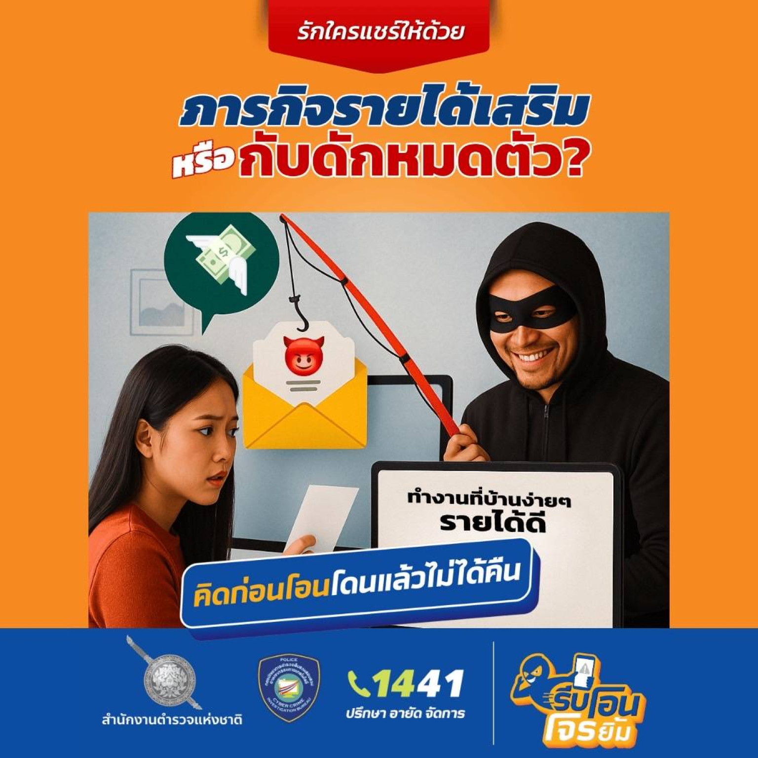ดังนั้นอย่าหลงกล อย่ารีบโอน อย่ารีบ-อย่าโลภ-อย่าลน-หาคนปรึกษา ทุกภารกิจที่ให้โอน มีแนวโน้มจะถูกหลอก ทุกระบบที่ “ถอนเงินไม่ได้” สัญญาณอันตราย ถ้าสงสัยว่าถูกหลอก - หยุดติดต่อทันที - รวบรวมหลักฐาน หรือโทร1441 ปรึกษา-อายัด-จัดการ มิจฉาชีพมาในหลายรูปแบบ อย่าให้ความหวังพาดิ่งลงเหวภารกิจจริงไม่ควรมีคำว่า “โอนก่อน”