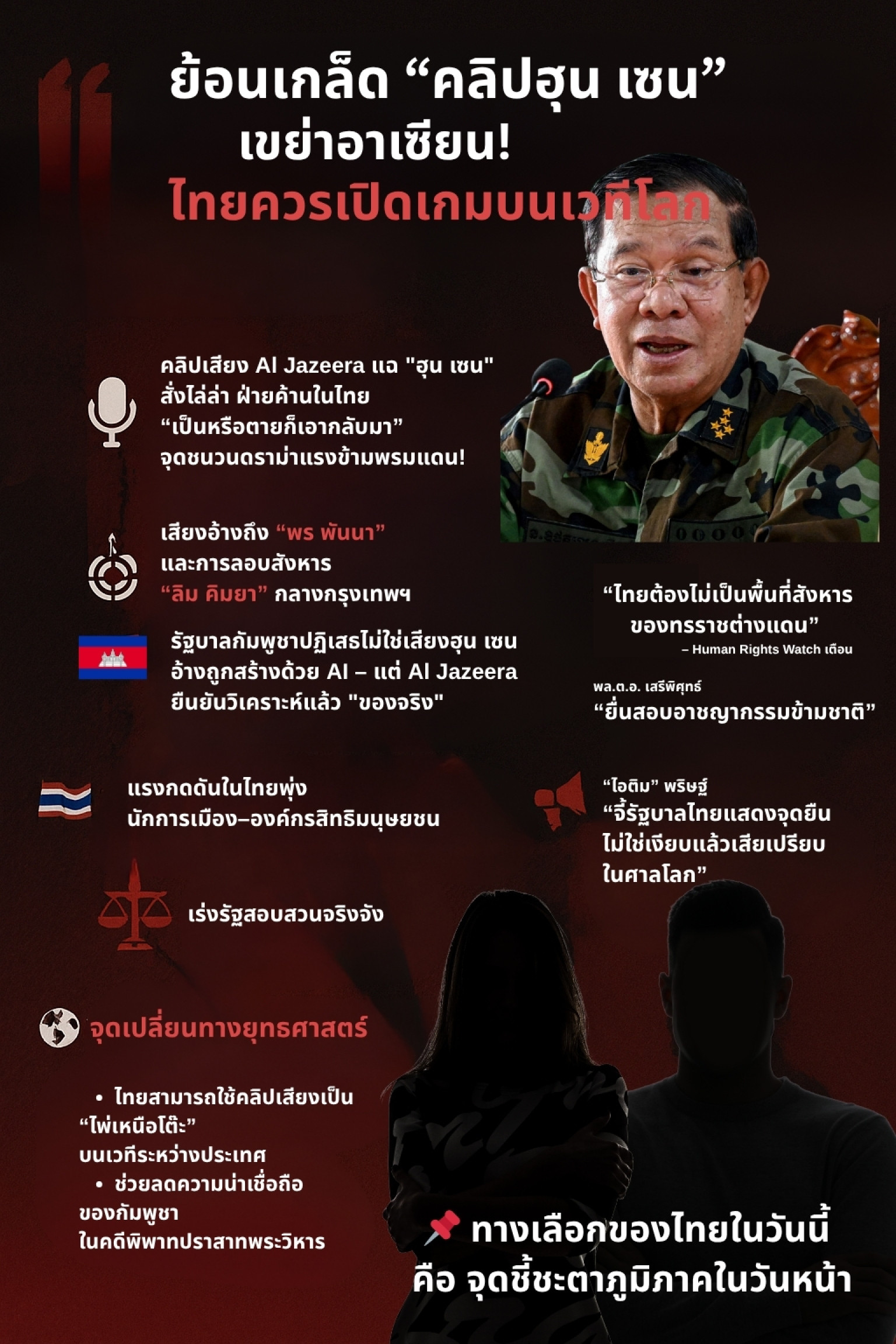 เมื่อกลางเดือนมิถุนายน 2568 สังคมออนไลน์และแวดวงการเมืองไทย-กัมพูชาต้องสั่นสะเทือน หลังสำนักข่าวระดับโลก Al Jazeera เปิดเผยคลิปเสียงที่ระบุว่าเป็นของนายฮุน เซน อดีตนายกรัฐมนตรีกัมพูชา และประธานวุฒิสภาคนปัจจุบัน สั่งการให้ "ตามล่าสังหาร" นักเคลื่อนไหวฝ่ายค้านชาวกัมพูชาที่ลี้ภัยอยู่ในประเทศไทย ไม่ว่าจะเป็นหรือตาย!
